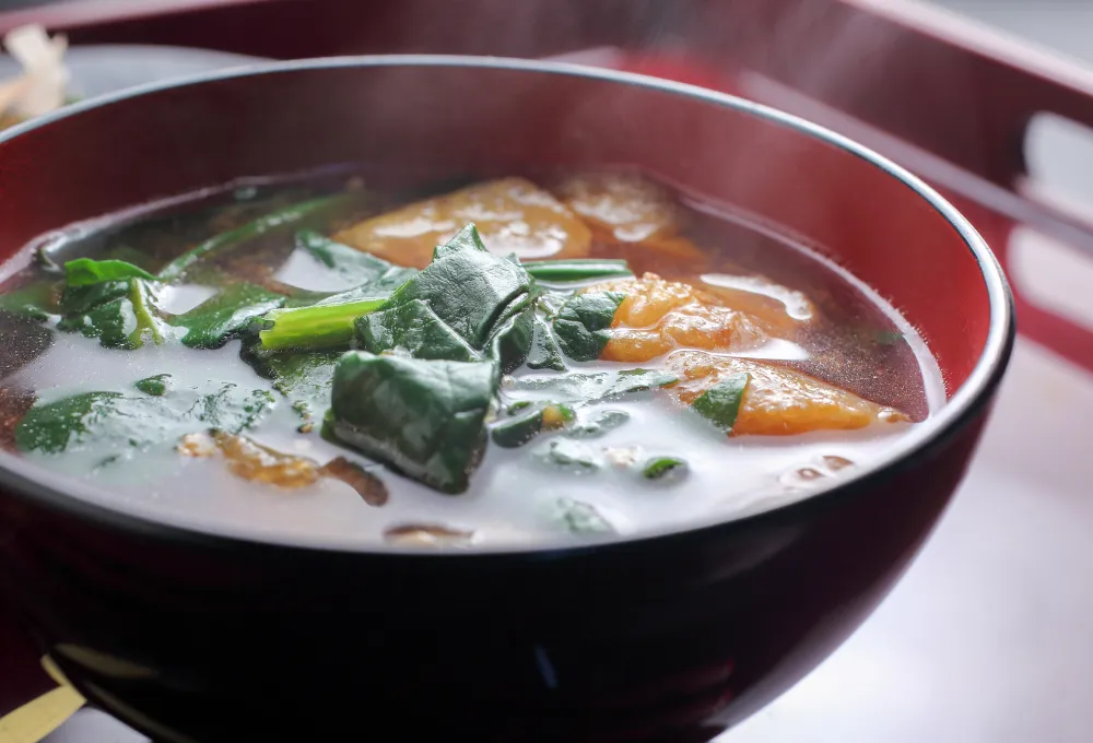 翌朝は、湯気立つ味噌汁、炊き立ての新米ご飯、出汁巻き卵、香の物など、ほっとする和朝食で一日をスタート。