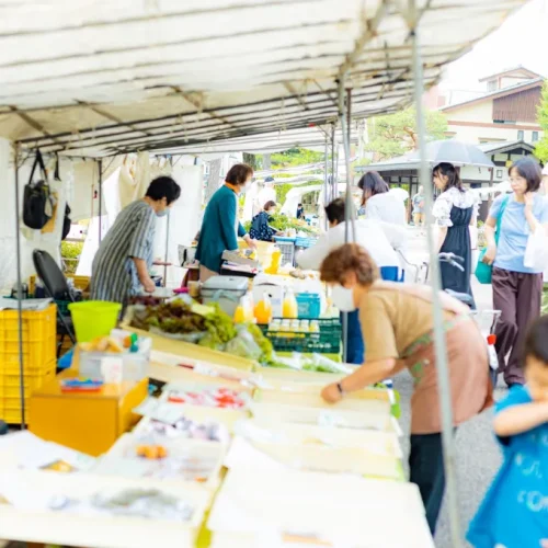 朝は宿から徒歩または送迎で地元の朝市へ。季節の野菜や果物、手作り味噌、地酒などを、地元の人との会話を楽しみながら選びます。