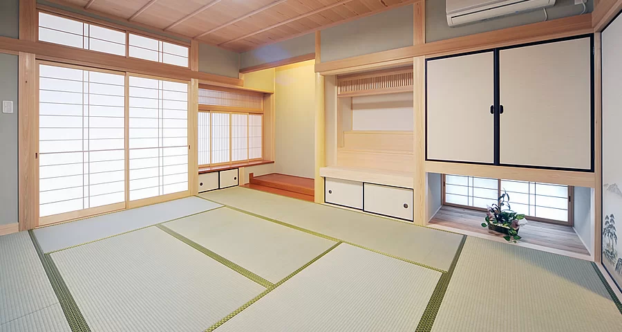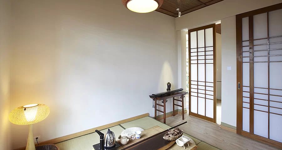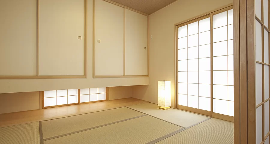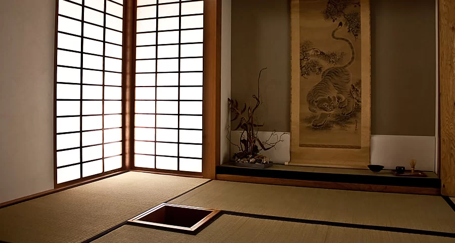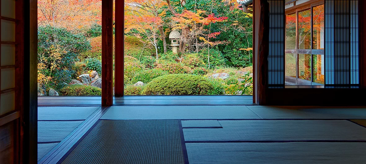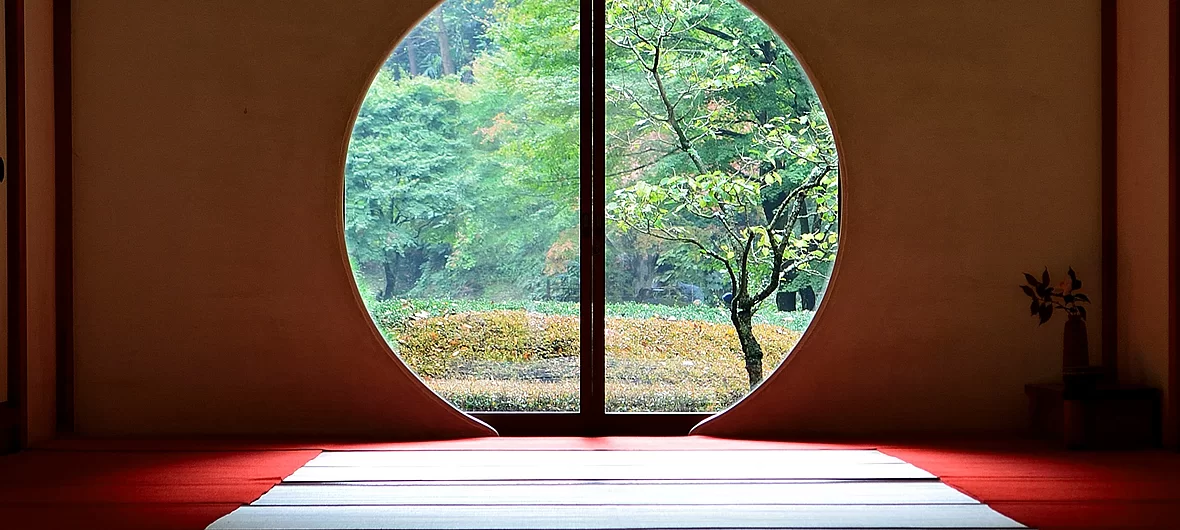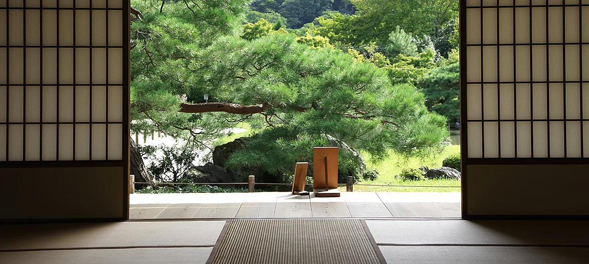 石灯籠や簾戸越しの朝の光に包まれながら、